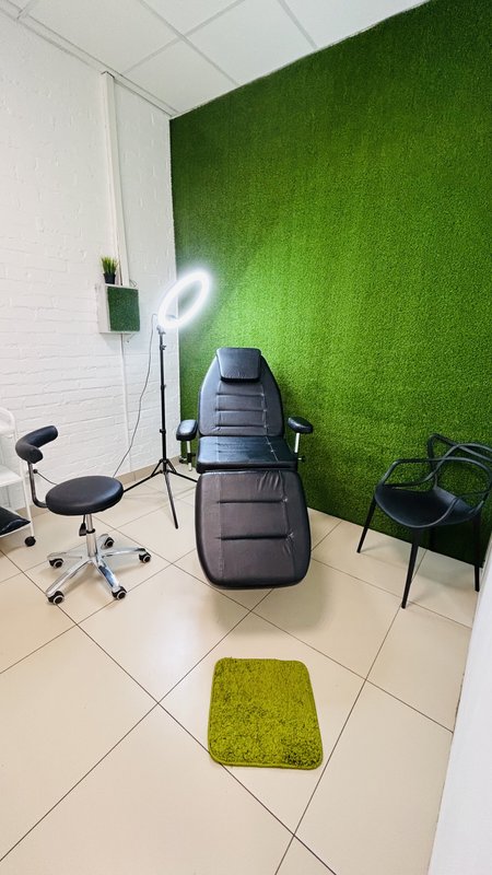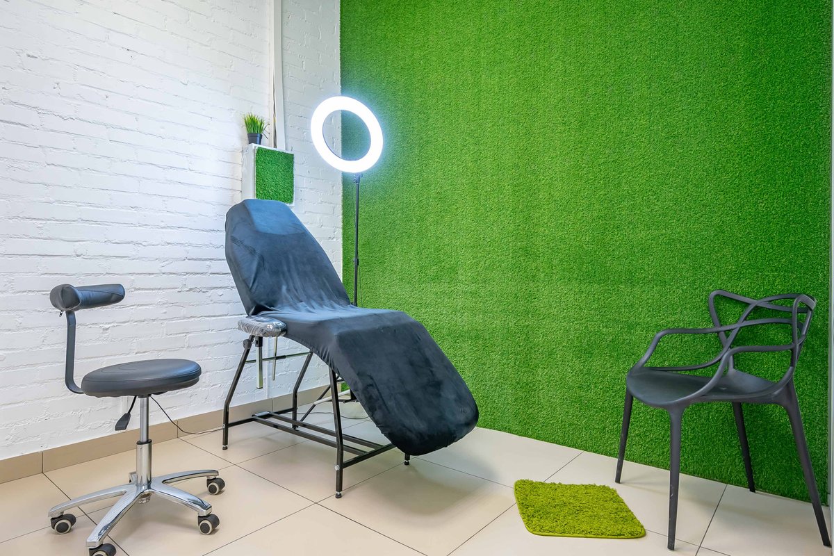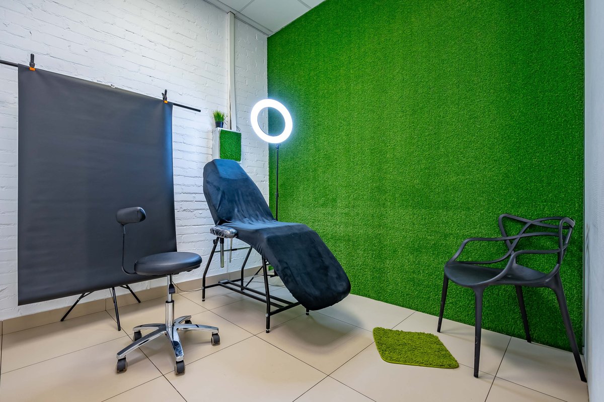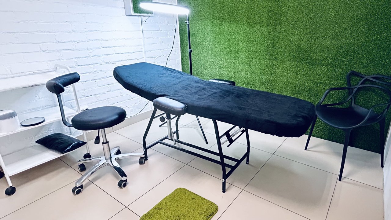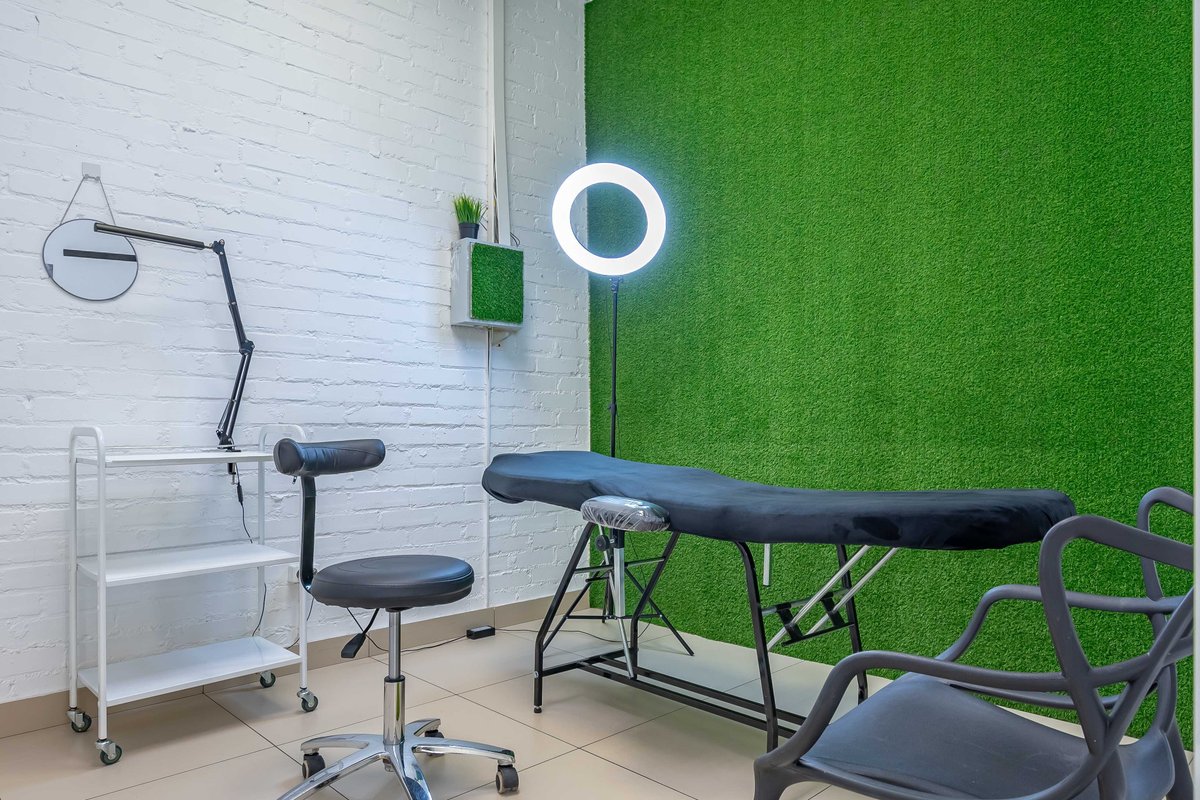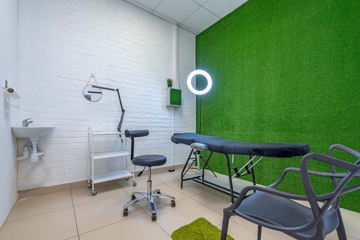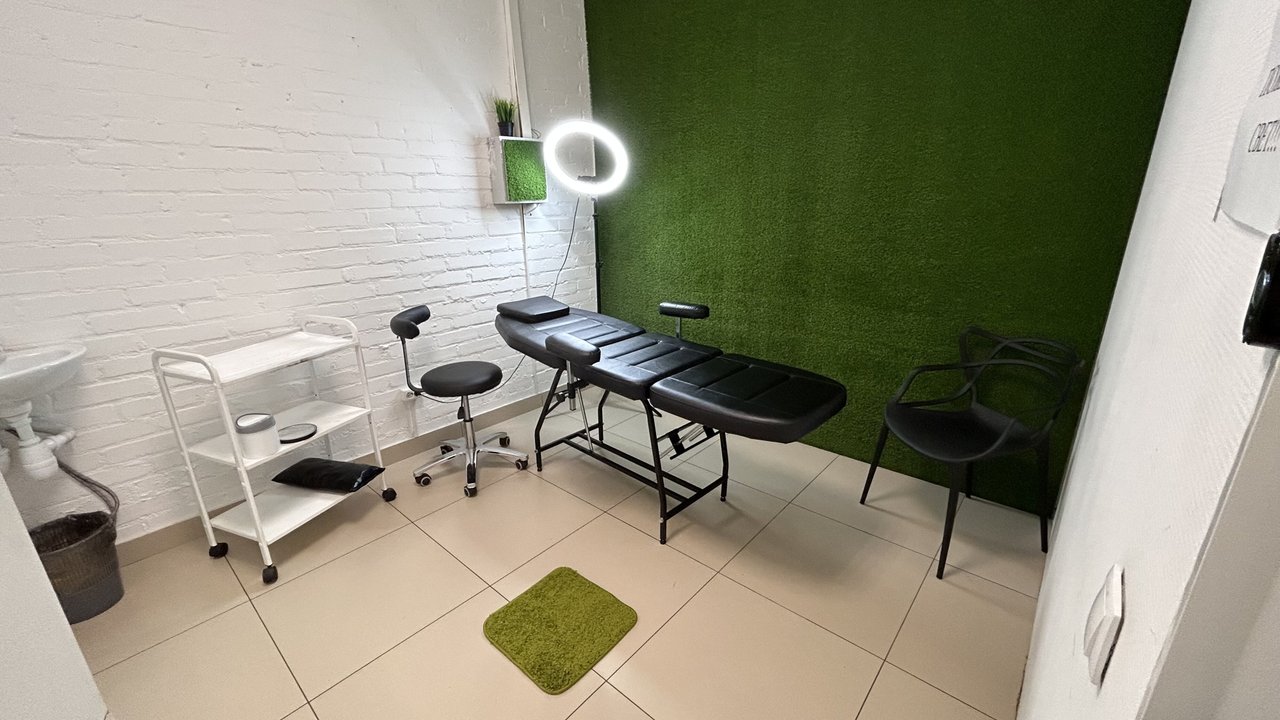 Косметологический кабинет с зелеными стенами, где я работаю, находится в хорошем состоянии. В аренду мне были предоставлены все необходимые принадлежности: кушетка, рабочая тумба, лампа и зеркало. Менеджер бьюти-коворкинга всегда на связи, вовремя отвечает.